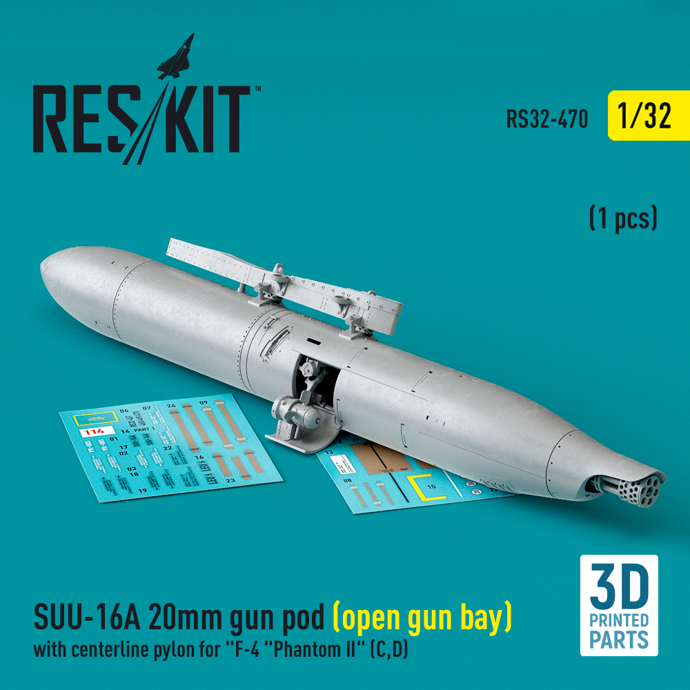 SUU-16A 20mm gun pod (open gun bay) with centerline pylon for F-4 Phantom II (C,D) (1 pcs) (3D Printed) (1/32)