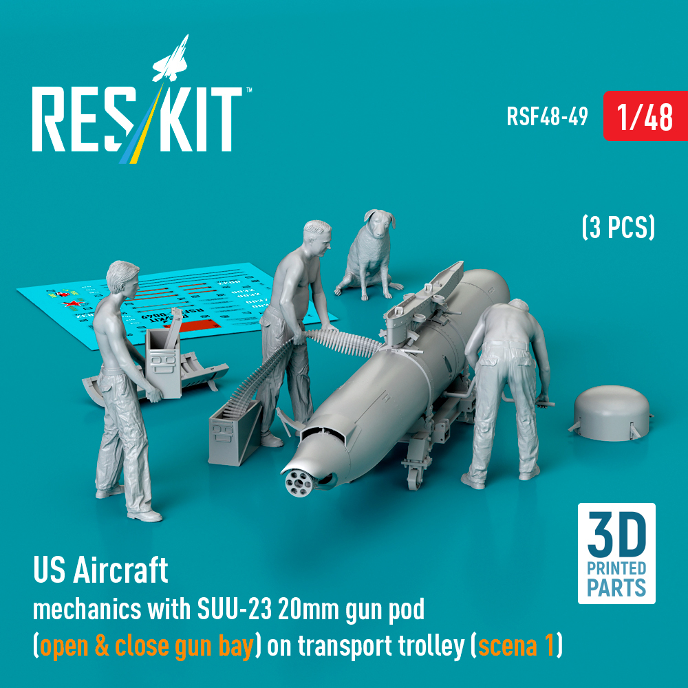 US Aircraft mechanics with SUU-23 20mm gun pod (open & close gun bay) on transport trolley (scene 1) (3 pcs) (3D Printed) (1/48)